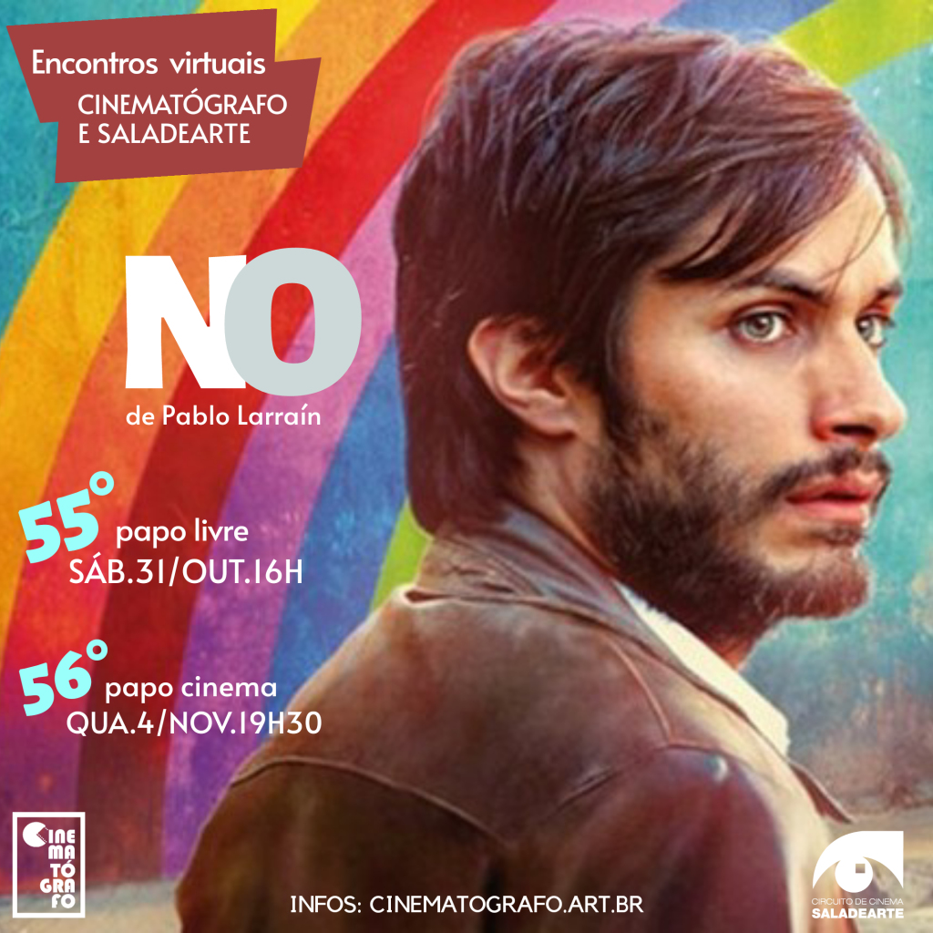 Nos dias 31 de outubro (sáb) e 4 de novembro (qua), nossos Encontros Virtuais Cinematógrafo e Saladearte terão como tema o filme “No” (2012), do diretor chileno Pablo Larraín.