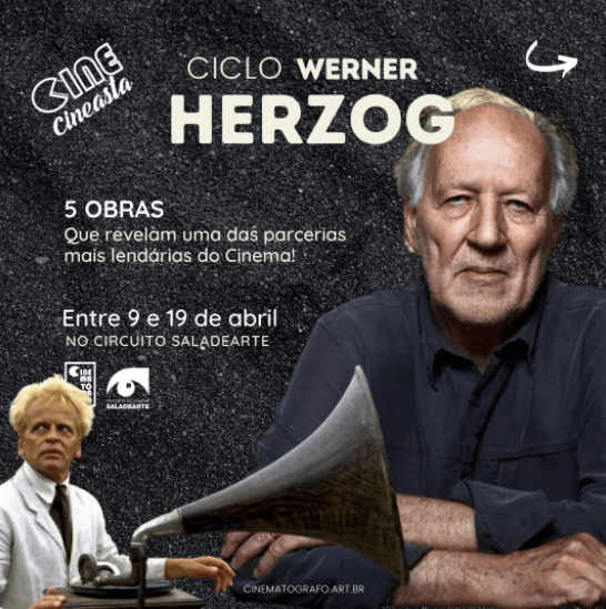 Entre 9 e 19 de abril de 2022, o Cinematógrafo – Cine Cineasta vai exibir cinco obras de Werner Herzog no Circuito de Cinema Saladearte, com sessões matinais no CineMAM (Museu de Arte Moderna, Av. Contorno) e o encerramento à noite no Cine Daten (Paseo Itaigara). As sessões são sempre precedidas de breves apresentações introdutórias e seguidas de conversas abertas no Café.