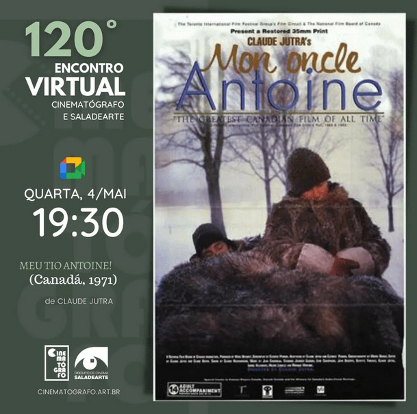 Nesta quarta, dia 4/mai, vamos ao nosso 120° Encontro Virtual Cinematógrafo e Saladearte! Os encontros virtuais se mantém, quinzenalmente, nas noites de quarta, sempre abertos e gratuitos. A dinâmica é participativa, com condução dos curadores, os cineastas Mel e Fabricio. O assunto, desta vez, é “Meu Tio Antoine” (1971), obra-prima de Claude Jutra, um dos nomes mais importantes do cinema canadense.