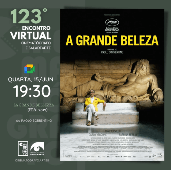 Nesta quarta, dia 15/jun, vamos ao nosso 123° Encontro Virtual Cinematógrafo e Saladearte! Os encontros virtuais se mantém, quinzenalmente, nas noites de quarta, sempre abertos e gratuitos. A dinâmica é participativa, com condução dos curadores, os cineastas Mel e Fabricio. O assunto, desta vez, é “A Grande Beleza” (2012), de Paolo Sorrentino, que exprime as ruínas de um mundo decadente mas cheio de pompa, dessacralizado e material, mas em desesperada busca de sentido espiritual e ânsia de beleza.