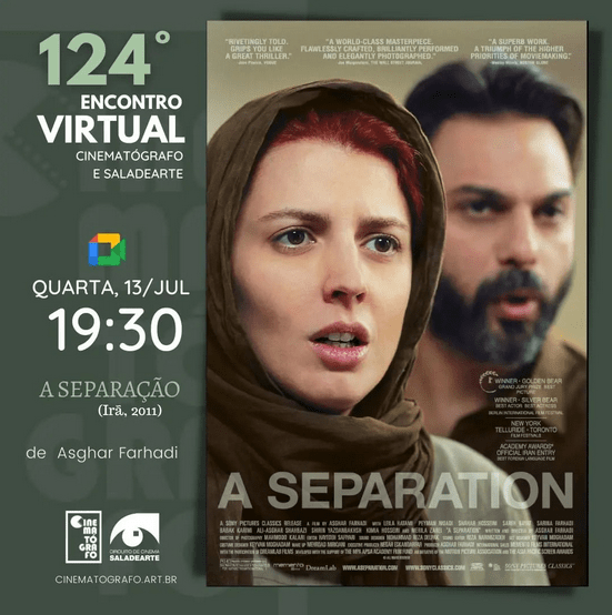 Nesta quarta, dia 13/jul, vamos ao nosso 124° Encontro Virtual Cinematógrafo e Saladearte! Os encontros virtuais se mantém, quinzenalmente, nas noites de quarta, sempre abertos e gratuitos. A dinâmica é participativa, com condução dos curadores, os cineastas Mel e Fabricio. O assunto, desta vez, é “A Separação” (2011), de Asghar Farhadi. Inscreva seu email para receber os links especiais, os acessos às salas virtuais e participar das conversas!