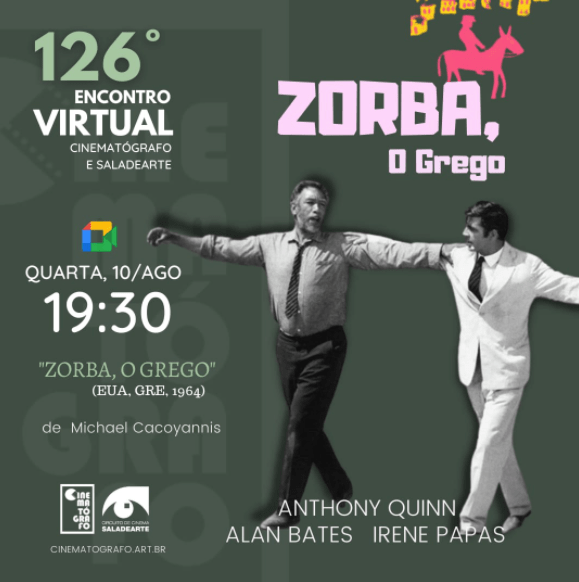 Nesta quarta, dia 10/ago, vamos ao nosso 126° Encontro Virtual Cinematógrafo e Saladearte! Os encontros virtuais se mantém, quinzenalmente, nas noites de quarta, sempre abertos e gratuitos. A dinâmica é participativa, com condução dos curadores, os cineastas Mel e Fabricio. O assunto, desta vez, é “Zorba, O Grego” (1964), de Michael Cacoyannis. Inscreva seu email para receber os links especiais, os acessos às salas virtuais e participar das conversas!