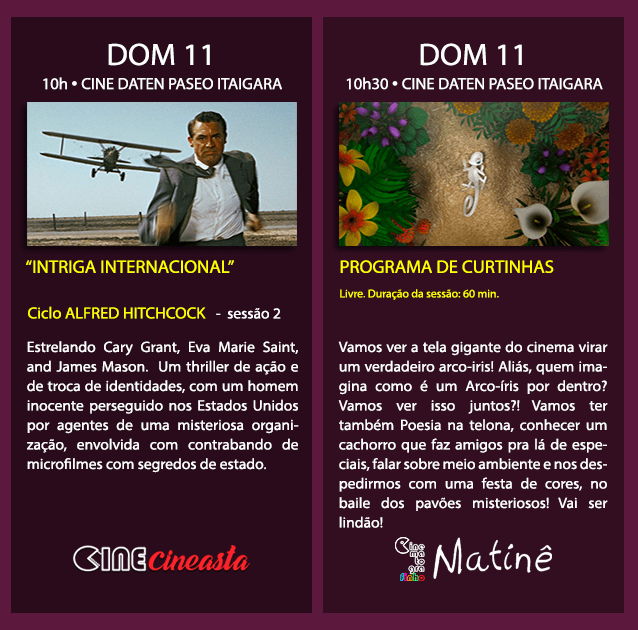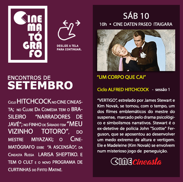- O Cine Cineasta traz o ciclo ALFRED HITCHCOCK, com quatro sessões, começando no Paseo. Em outubro, teremos outras duas sessões do mestre. São sessões únicas de cada filme.