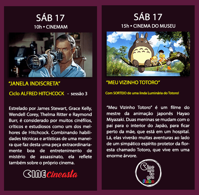 - O @cinematografinho traz, numa tarde de sábado (17), o clássico “Meu Vizinho Totoro”, do mestre Miyazaki. E vai ter sorteio de uma linda luminária para os presentes na sessão. Sessão única, às 15h, no Cinema do Museu, na Vitória.
