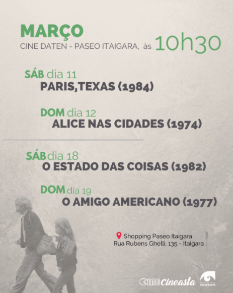 Veremos, ainda em março, “O Estado das Coisas” (1982) e “O Amigo Americano” (1977). Em abril, veremos “Movimento em Falso” (1975) e “No Decurso do Tempo” (1976), filmes que, juntos com “Alice nas Cidades”, são vistos como uma trilogia wenderiana. Veremos também o belíssimo “Pina” (2011) e convidaremos a uma imersão, vendo, em sequência, a obra-prima “Asas do Desejo” (1988) e sua inesperada continuação, “Tão Longe, Tão Perto” (1993), prêmio do júri em Cannes.