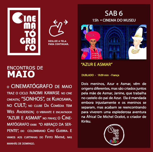 CINEMATOGRAFINHO E MATINÊ: vamos começar com a vibrante aventura “Azur e Asmar”, no Finho da Tarde de sábado (7), no Cinema do Museu. Sessão única, em versão dublada em português. Nas Matinês de domingo, temos dois programas de Curtinhas, que passam em domingos alternados.