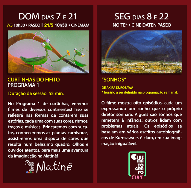 Em maio, vamos ver “Sonhos”, de Akira Kurosawa no CULT e um filme colombiano na Sessão Cinematógrafo. Confira também a programação do Cine Cineasta, do Cinematografinho e do Clube da Comédia, as nossas diferentes ações mensais que acontecem na Saladearte.