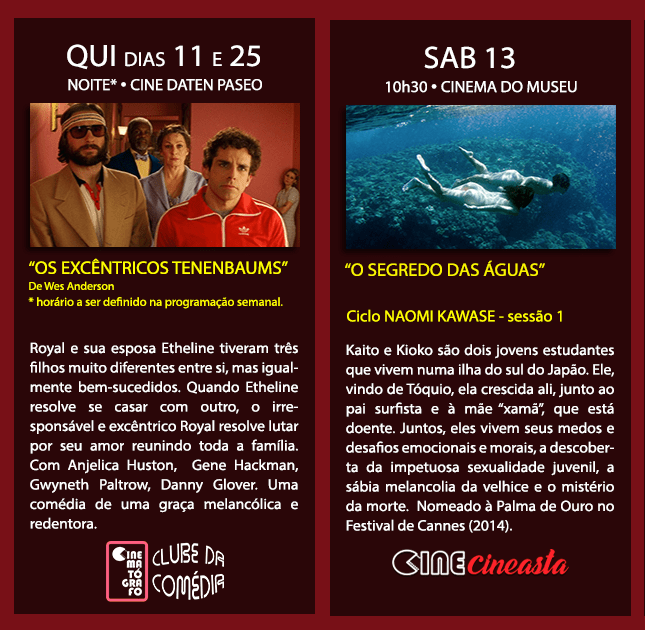 CLUBE DA COMÉDIA: um Wes Anderson clássico nas duas noites de quinta (dias 11 e 25), no Paseo. Vamos ver “Os Excêntricos Tenenbaums”.
