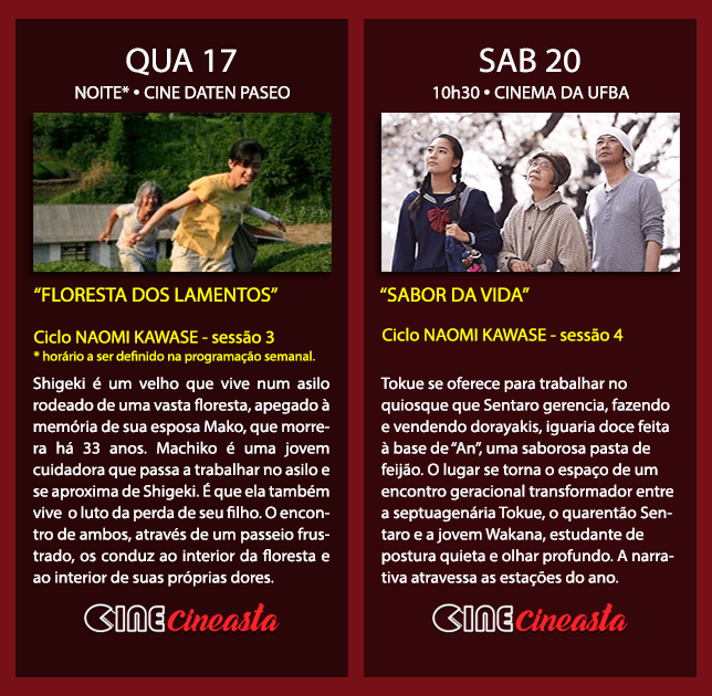 CINE CINEASTA: o nome desse mês é Naomi Kawase. Vamos ver cinco filmes da diretora contemporânea japonesa, cuja obra mescla sensorialidade e temas sensíveis. A sessão de abertura é sáb (13), 10h30, no Cinema do Museu, com “O Segredo das Águas”. O ciclo vai até o dia 21.