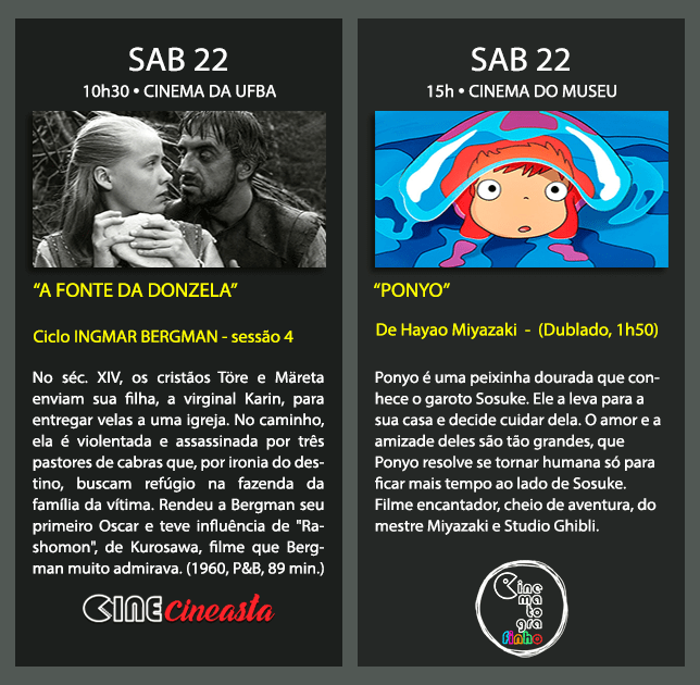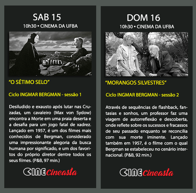 INGMAR BERGMAN é o nome do Cine Cineasta de julho/agosto. O ciclo Bergman exibe, este mês, 5 filmes do diretor. Outros cinco completarão a mostra em agosto. Começa no sáb, dia 15. Sessões no Cinema da UFBA e no Cine Daten Paseo.