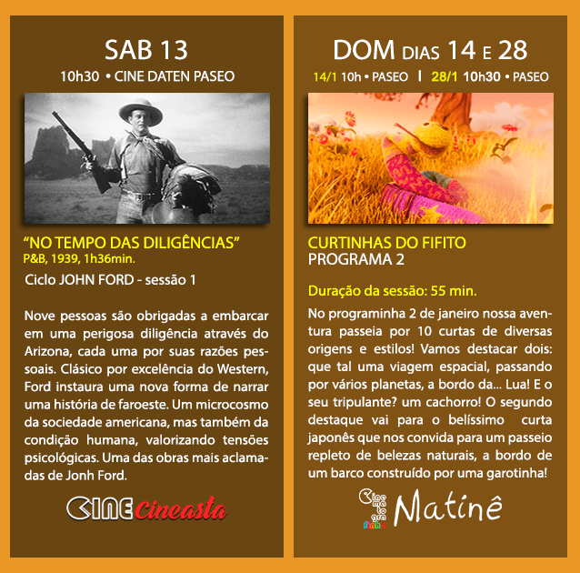 Ciclo John Ford: o CINE CINEASTA traz cinco filmes do mestre “irlandês”, tão admirado por outros mestres como Glauber Rocha, Akira Kurosawa, Orson Welles e Ingmar Bergman. Ford elevou a outro patamar o gênero do faroeste. Vamos descobrir por quê? O ciclo acontece entre 13 e 21 de janeiro, este mês, sempre no Cine Daten Paseo, com sessões seguidas de conversa. Acompanhe as postagens específicas do ciclo aqui em nosso perfil.