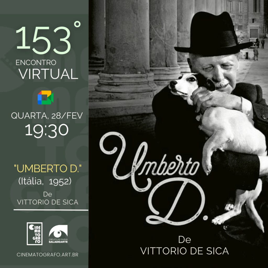 Nesta quarta, 28 de fevereiro de 2024, vamos ao nosso 153° Encontro Virtual Cinematógrafo. O assunto, desta vez, é “Umberto D.” (1952), obra-prima do neorrealismo italiano, dirigido por Vittorio De Sica.