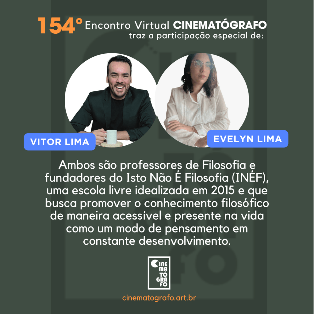 Com vistas a isso, o nosso 154º Encontro Virtual Cinematógrafo contará com a presença de dois convidados especiais: Vitor Lima e Evelyn Lima! Ambos são professores de Filosofia e fundadores do Isto Não É Filosofia (INÉF), escola livre, idealizada em 2015, que busca promover o conhecimento filosófico de maneira acessível e presente na vida como um modo de pensamento em constante desenvolvimento.