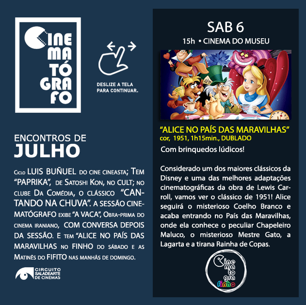 Programação de julho dos encontros presenciais Cinematógrafo na Saladearte!