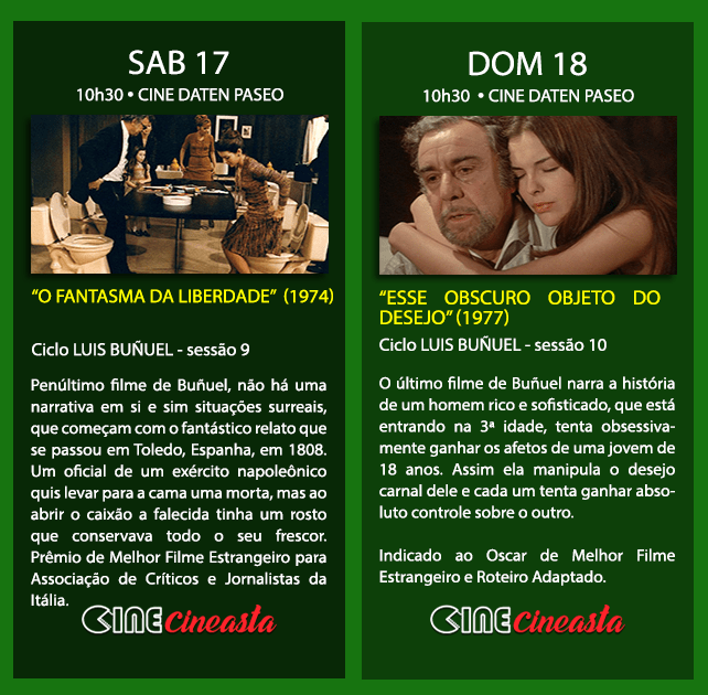 🎬 CICLO: Em AGOSTO, o Cine Cineasta reroma a segunda e última etapa do Ciclo Luis Buñuel, iniciado em julho. Vamos ver mais cinco filmes do mestre aragonês, todos realizados em parceria com o roteirista Jean-Claude Carrière. Todas as sessões do ciclo serão no Cine Daten Paseo.