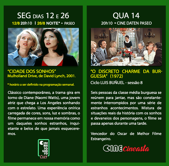 🎬 No CULT, imperdível, tem “CIDADE DOS SONHOS” (Mulholland Drive, 2001), de David Lynch, obra única, tributária, a seu modo, do cinema surrealista de Buñuel. Sessões em duas noites de segunda, sempre à noite, no Paseo (horários são definidos na semana da programação da Sala).