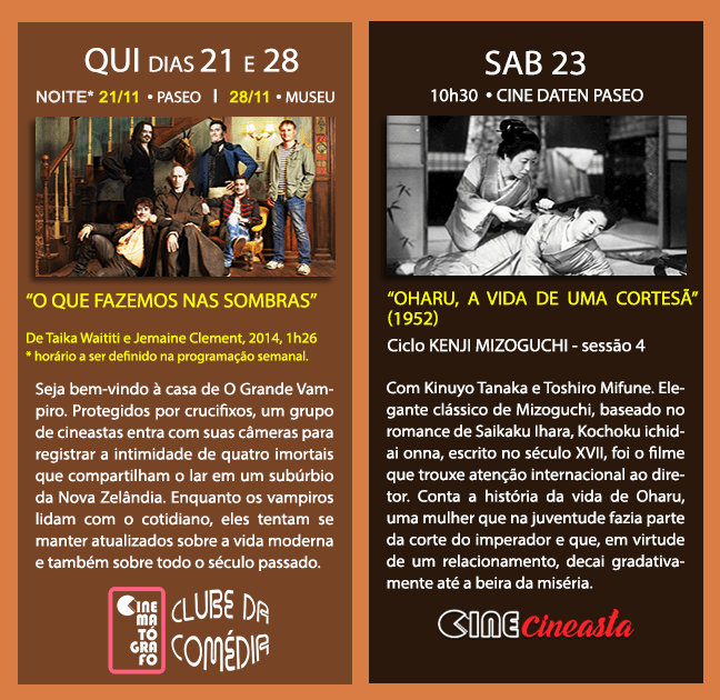 📍CLUBE DA COMÉDIA: muito bom filme dos comediantes Jemaine Clement e Taika Waititi, que estão no elenco, “O que fazemos nas Sombras” é um mockumentary (cienastas estao na casa para filmar a vida dos vampiros) que mistura comédia, terror e fantasia, com cenas do inesperado cotidiano dos vampiros. Imperdível!