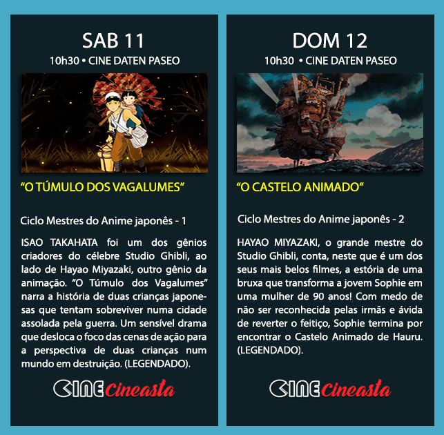 CINE CINEASTA: neste mês, a coisa é diferente. Em vez de um nome do cinema, vamos fazer um ciclo com filmes de quatro grandes nomes, todos mestres da animação japonesa. Vamos ver filmes de Isao Takahata, Hayao Miyazaki e Makoto Shinkai. Todos belos filmes de cineastas que ajudaram a elevar a animação ao alto nível dramático, psicológico e estético. O ciclo trará outras obras em fevereiro