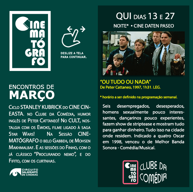 CLUBE DA COMÉDIA: humor britânico em duas noites de quinta, com o filme “The Full Monty”, de Peter Cattaneo, vencedor do Oscar de Melhor Trilha Sonora de comédia e Indicado aos de Melhor Filme, Melhor Diretor e Melhor Roteiro Original, além de ter sido nomeado ao Globo de Ouro.