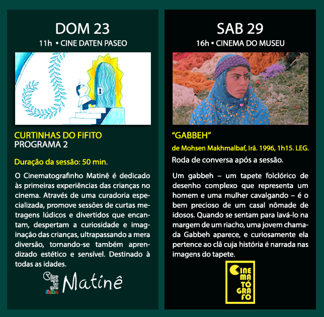 SESSÃO CINEMATÓGRAFO: no último sábado do mês, no Cinema do Museu, tem o bonito “Gabbeh”, do cineasta iraniano Mohsen Makhmalbaf. Depois da sessão tem roda de conversa sobre o filme.