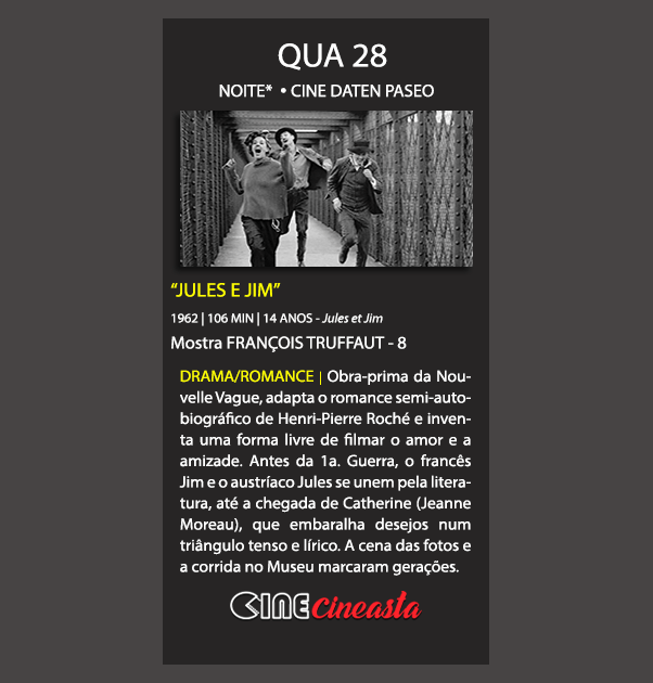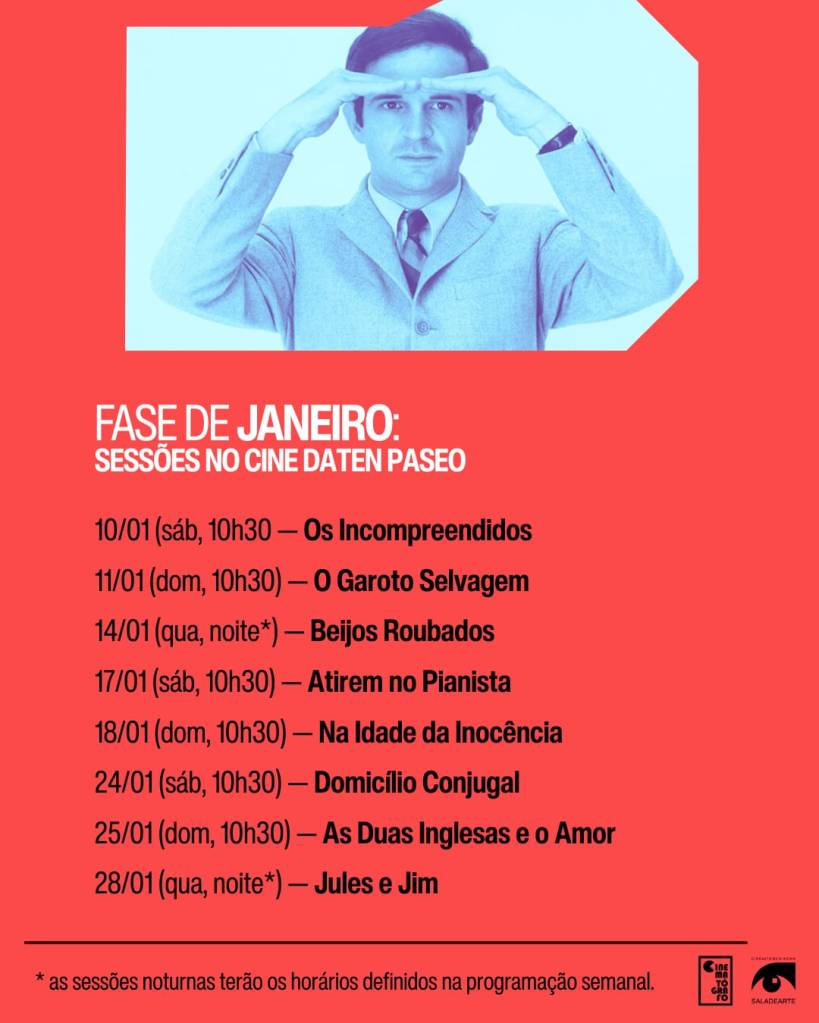 Para esta Mostra, adotamos uma ordem ontológica em vez da cronológica! É o passeio pelas sensibilidades dos diversos momentos criativos do cineasta que nos guiará! Em janeiro, vamos percorrer a primeira parte dessa jornada, com sua graça e sua tragédia, seu drama e seu humor, exibindo oito filmes e encerrando com o inesquecível “Jules e Jim”, uma ode à vida cujas cenas marcaram a iconografia do cinema na fase da Nouvelle Vague.