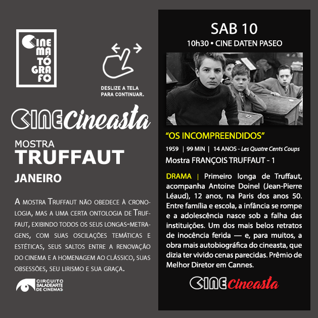 Vamos abrir a Mostra François Truffaut do Cine Cineasta com o mito fundador do diretor, dedicando o primeiro fim de semana à temática do desamparo infantil, abordada, em filmes de fases diversas, por diferentes prismas truffautianos.