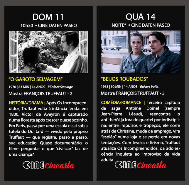 Começamos com Os Incompreendidos, seu filme mais autobiográfico e que lança o crítico enfant terrible à condição definitiva de cineasta reconhecido. Seguido de “O Garoto Selvagem”, um outro olhar sobre a criança desamparada diante das imposições civilizatórias, com o próprio Truffaut em cena!