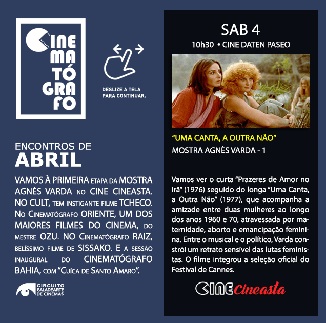 Em abril e maio, estaremos em companhia de Agnès, abrindo a mostra com sessão dupla: o curta “Prazeres de Amor no Irã”, de 1976, é uma introdução a um dos filmes mais belos e fortes da diretora, “Uma Canta, A Outra Não”, de 1977. Vamos ver a ambos na sessão de abertura. E mais sete filmes de Agnès este mês. Em maio, seguiremos com ela!