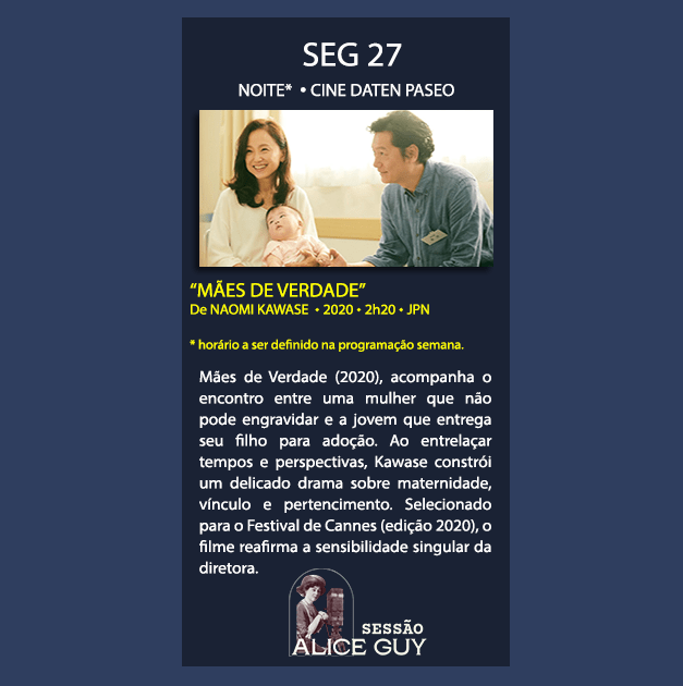 A nossa sessão cujo nome homenageia a pioneira Alice Guy-Blaché, e que é dedicada a filmes dirigidos por mulheres. Neste mês, um dos mais poderosos filmes da diretora japonesa contemporânea, Naomi Kawase.